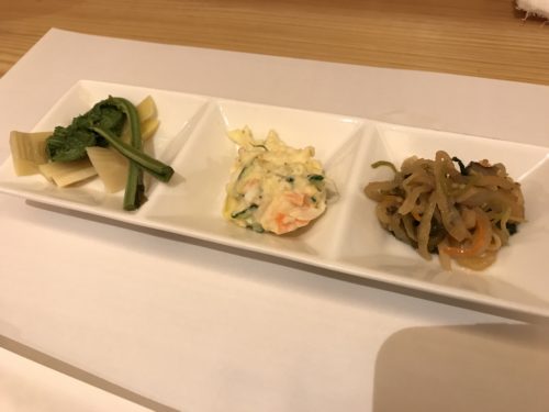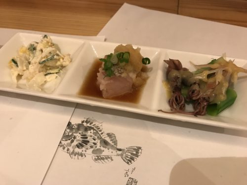 ビールをいただきながらお任せでお願いしました!この日もショーケースにはおいしそうなお魚たちがたくさん入荷されていました!先付からいただきます。ぜんまい懐かしい~!