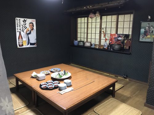 この日は人数の関係で奥の座敷でした。まずは生ビールで乾杯です!事前にお料理はおまかせでお願いしていました。