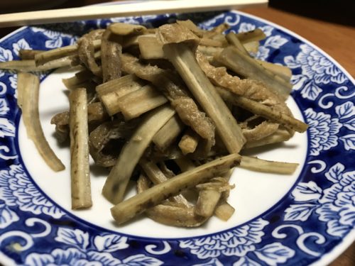 まずはごぼうのきんぴら風から登場しました!ボリューム満点!そしてめちゃめちゃおいしい~!これはかなり当たりのお店ですよ!ごぼうも大き目で食べ応えがあります。