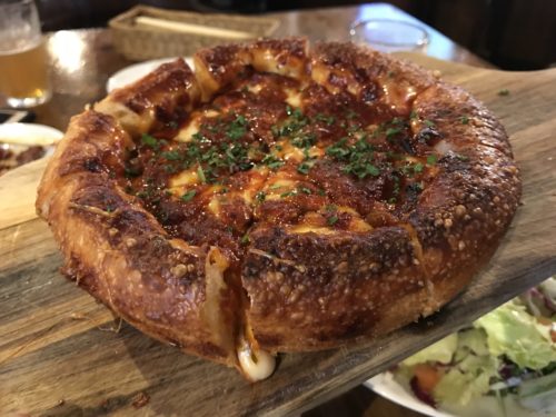 シカゴスタイルのディープディッシュピザもおすすめ!ほかのお店で見ることがないこのピザ、チーズがあふれてきますよ~!めちゃおいしい~!