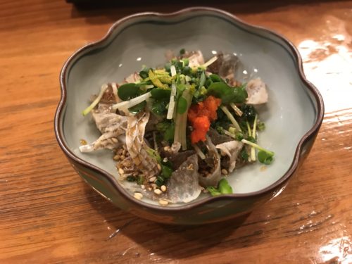 生ビールで乾杯してまずは鯛皮ポン酢を!素晴らしいとしかいいようがないです!天然一本釣りの鯛の皮!貴重です!