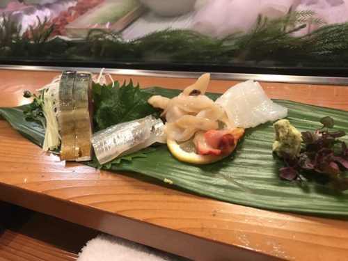 お刺身をいただきました!しめ鯖、ミル貝、夜泣き貝、サヨリ、イカ!どれもおいしいですが、特にしめ鯖とミル貝が!あとで握ってもらおう!