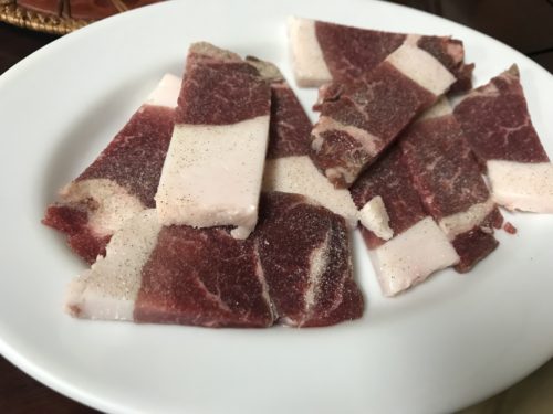 そしてお待ちかねのイノシシ肉が登場しました!このぼてじゅうさんのイノシシがめちゃめちゃ甘い!もう脂がハンパなく甘いです。こんなに脂があったら私は普通は嫌になるのですが、大間違い!超がつくほどのおいしさです!