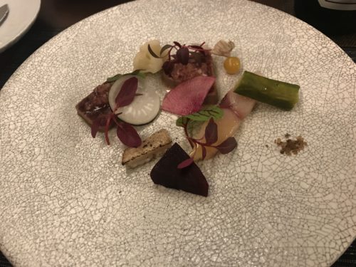 まずは前菜が登場しました!美しいですね~!竜飛岬でとれた13日間熟成をかけたマグロ、おばこさわらのスモーク、ヒラメの炙りに神奈川県は鎌倉の野菜をあわせたものでした。これがどれもめっちゃめちゃおいしい~!素晴らしいおいしさでした!最高!