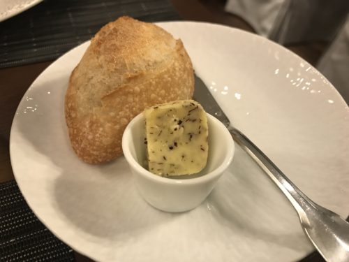 パンが登場しました。こちらがフランスから直輸入されたパンで半分フランスで焼いて冷凍してこちらで焼き上げたパンです!香りがとってもよくておいしい~!バターは海藻が練りこまれていました!こちらが最高においしい~!
