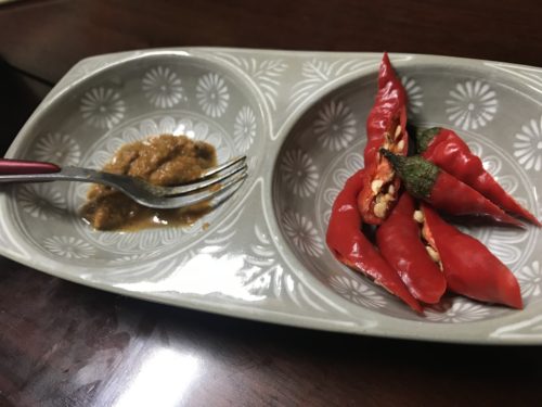 お鍋をいただく際にとうがらしや手作りゆず味噌などを入れていただくとさらにとってもおいしいです!とうがらしはつけすぎるとめちゃめちゃ辛くなるので要注意です!