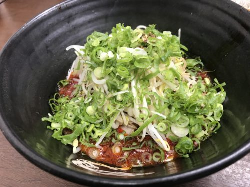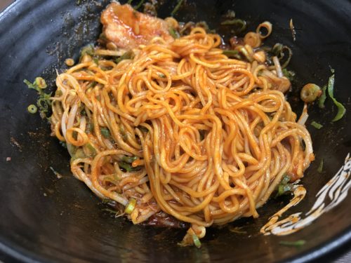 まずは汁なしそばが登場しました~!少し入っているタレが結構赤くてびっくり!しっかり混ぜていただきました~!おおお!ピリ辛!うまみの後にくる辛さがたまりませんね~!
