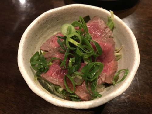 まずは生ビールで乾杯して、この日のおすすめをいろいろとお願いしてみました~!先付は牛のもも肉!あっさりといただけておいしい~!