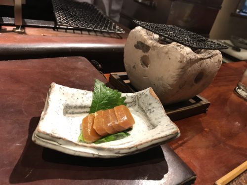自家製のカラスミがありましたのでお願いすると、まずは炭火が登場しました!炙っていただくようです!カラスミに興奮しすぎて話に夢中になり焦がしそうになるところを大将に救っていただきました。目を配られている姿に感動しながら、からすみをいただくとこれがまた上品!塩のききかたが絶妙でしたね~!なんと素晴らしいカラスミでしょうか!たまりません!日本酒がぐいぐいすすみました~!