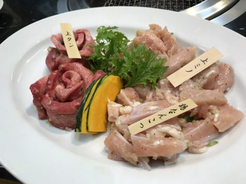 まずは塩ものからお願いしました!上タン、上ミノ、鶏なんこつです。まずは上タンから!トングで上タンを持ち上げた瞬間に柔らかくておいしそうなのが伝わってきます。軽く両面を焼いた後に塩ダレでいただきます。うまい!本当にうまい!たまらないうまさ!やばいです、これは!そして上ミノも!これがまた柔らかくてうまみがあって最高!あ~、いまからもう一度食べに行きたいくらい~!素晴らしいおいしさです~!鶏なんこつはお酒のつまみに最高でした~!