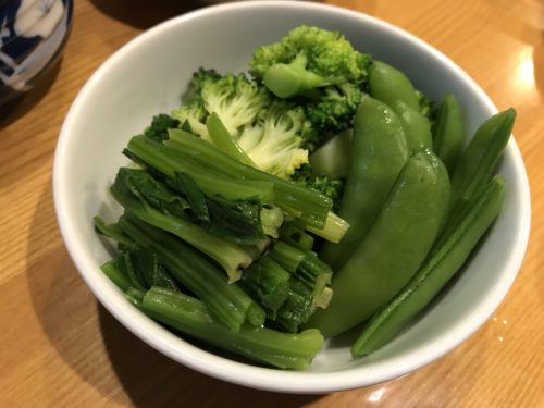 という話で盛り上がりながらおいしい一品をいただきます!まずは瓶ビールで乾杯させてもらいました!今日は何をいただこうかな~と思いながらまずは野菜からいただきます。ほうれん草、スナップエンドウ、ブロッコリーです。緑三兄弟をマヨネーズにつけながらいただきました!おいしいですね~!