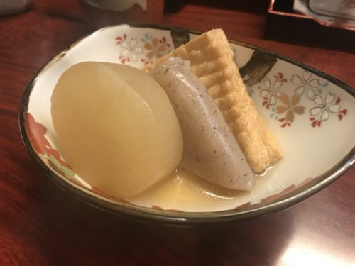 この日はおでんがあったので大根、こんにゃく、厚揚げをお願いしました。厚揚げは絹、おいしいですね~!お出汁も素晴らしいです!