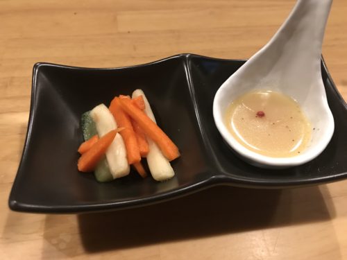 まずは生ビールで乾杯させてもらって、先付はじゃがいものスープと酢漬け。おいしいですね!~