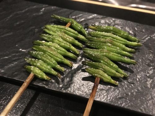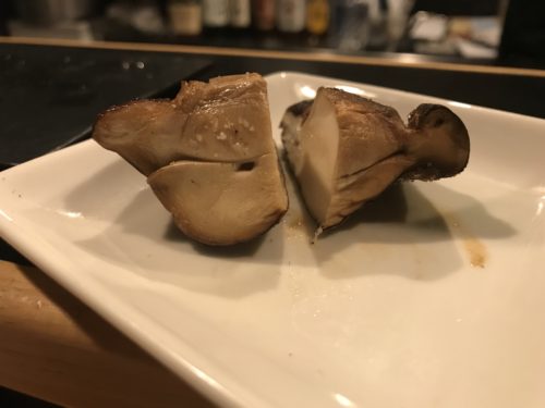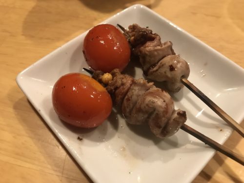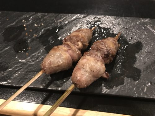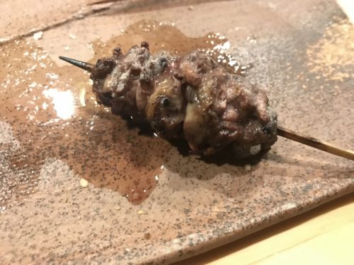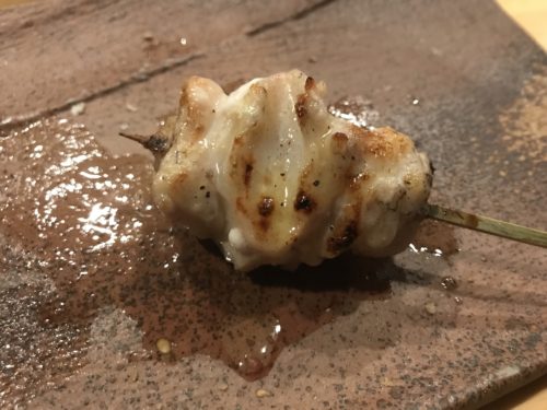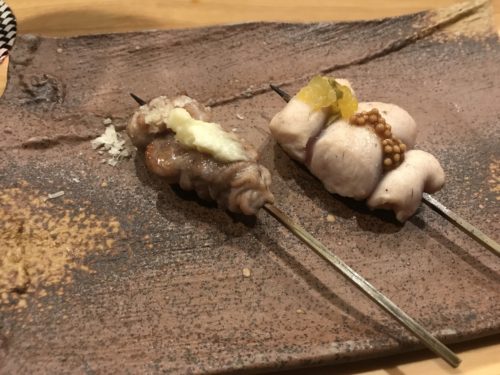 焼き鳥のお店なのですが、おまかせをお願いしました!まずはささみとせせりが登場しました!ささみには粒マスタードが!高級ですよね~!おいしい~!せせりも超おいしい~!梵ろさんではだいたい一味工夫されています。素晴らしい~!