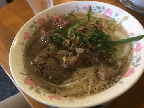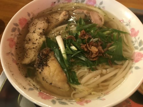 鶏肉のフォーのセットが登場しました!サラダ、デザート、そして鶏肉のフォー!とってもおいしそう~!まずは鶏肉からいただきます。スープがたっぷりしみていておいしい~!最高ですね~!麺もとってもおいしい~!そしてとにかくボリュームが満点!素晴らしいです!