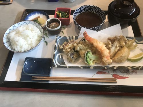 そこにまずは友人の天ぷら定食が登場しました~!おいしそう~!ごはんと汁はおかわり自由なんですって!なんともいえない美しい天ぷらたち!