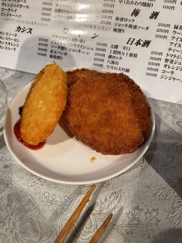 揚げ物が登場しました!メンチカツとコロッケ!これだけ食べて500円だなんて確かに安い~!メンチカツもコロッケも美味しいですよ~!