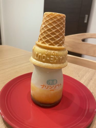 コーンの部分をとって気づきました。プリンの上にソフトクリームがのっていたんですね!なるほど~!ということでそのまま溶けた状態で食べてみると、ソフトクリームの美味しさが伝わってきました。ミルク~って味がします!プリンも美味しい!