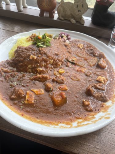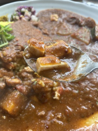えええ?カレーにお豆腐ですか?合うのかな?と思いながらいただいてみるとこれが合う~!カレーにお豆腐ってめっちゃあう~!今度自分でカレー作る際にやってみよう!このチキンカレーはとっても食べやすくて美味しい~!スパイスもほどよくきいています!
