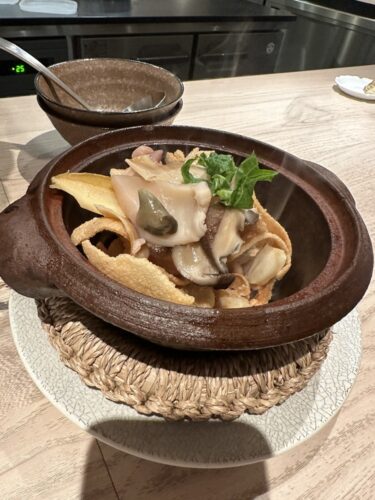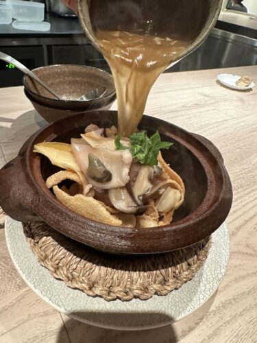 「アワビ入りの自家製のおこげです!もしお写真を撮られるならご用意を!」