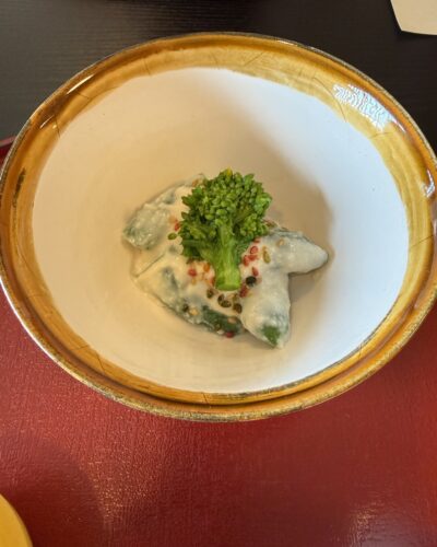 白和えはスナップエンドウ、甘みがあってこちらも素晴らしい~!柚子豆腐も最高でした!