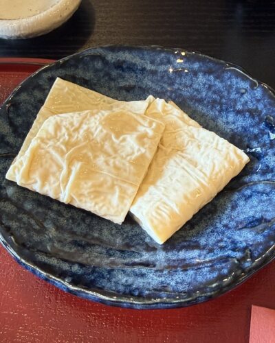 揚げたてのお揚げさん!下のお豆腐屋さんで揚げたものをすぐに持ってあがってくださいました!まずはそのままいただきます!おおおお!これがお揚げさん本来の風味!続いてお醤油をすこしだけかけていただきます。めちゃうま~!お酒がほしくなりますね~!