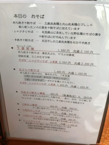 席についてメニューを見ながら何をいただこうかな~と。ふと見ると手挽き十割もりそばとあって数量限定で一日5食とありました。これにしてみよう!お願いするとお店の方から昨日から用意できるようになったんですよ~と。奇跡的ですね~!ほかにもいろいろとお願いしてみました!