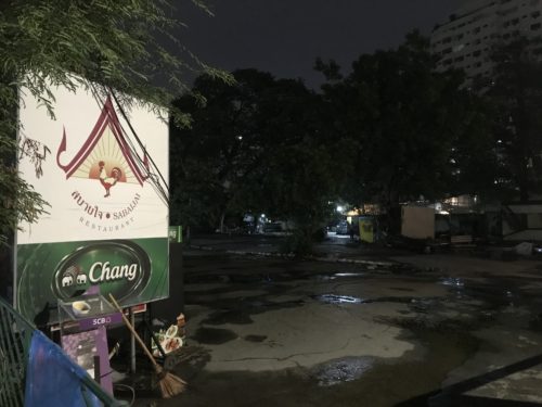 そのうちの一つで数年前から通っている一つがエカマイから少し北上したところにありますサバイジャイガイヤーンというお店。現地の人からかなりの人気を集めているお店です。ということでいつものように向かって駐車場に入ろう、、、あれ?フェンスが、、、しかも暗い、、、あらら?