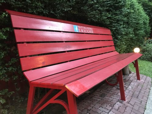 お店に到着すると大きな赤いベンチがお出迎え。これに座ってよく写真撮られていますよ!ただ、乗るのが一苦労です。笑