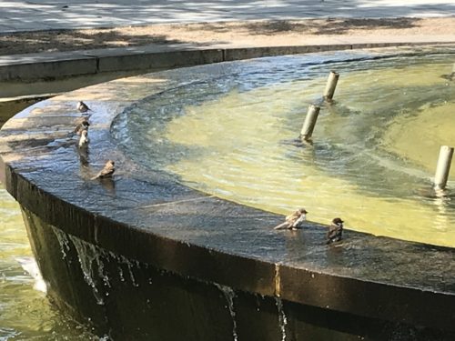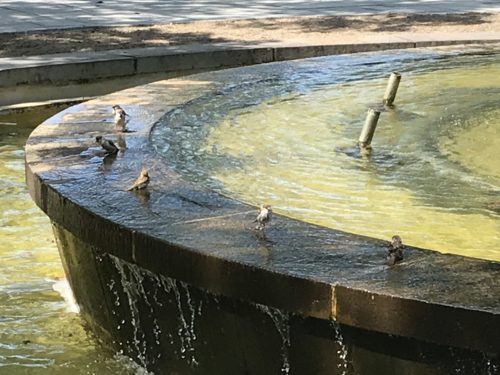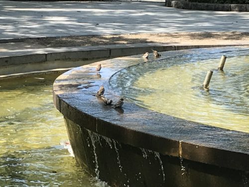 さて、この暑さの中私はもちろん歩いて出勤をしております。その出勤途中に平和公園を通っているのですがふと原爆ドーム近くの噴水をみてみると、、、あら、、、噴水がでていないじゃないですか。時間帯によって噴水がでたりでなかったりするのかな?と思っていた瞬間、、、パタパタパタとすずめさんたちがやってきました。