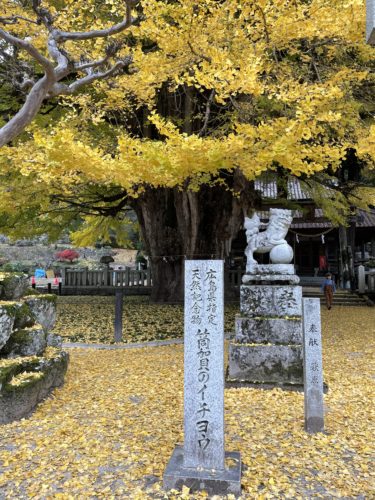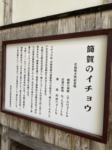 遠くからみてもすぐにわかるくらい大きないちょうの木です!なんと高さは48メートルもあるんですよ~!すごくないですか~!根回りは10メートルを超える大きさです!本当にすごい大きないちょうです!広島県の天然記念物にも指定されていて、推定樹齢はなんと1100年!
