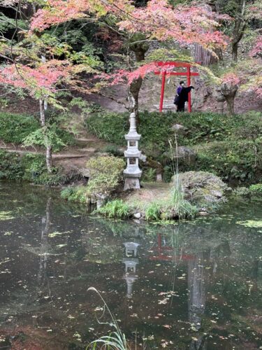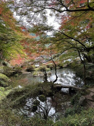 庭園の中央に池がありましてその水面に周辺の風景が映し出されてとっても美しいんです。