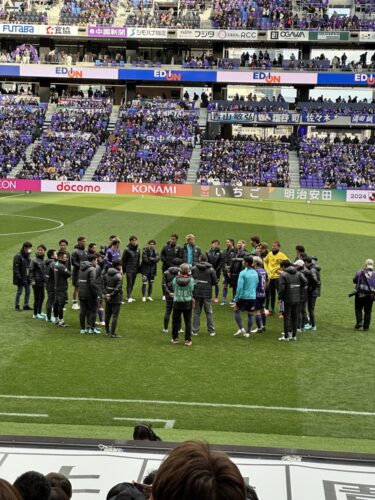 勝利した後に選手がピッチの中で円陣を。監督がなにかをおっしゃって選手がうぉ~~って大喜び!あとで聞いてみると監督が休みの日数を言い渡すのが恒例だそうで今回は長いお休みだったので喜んでいるのではないかと。