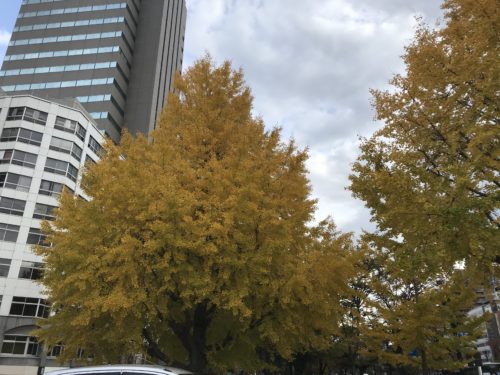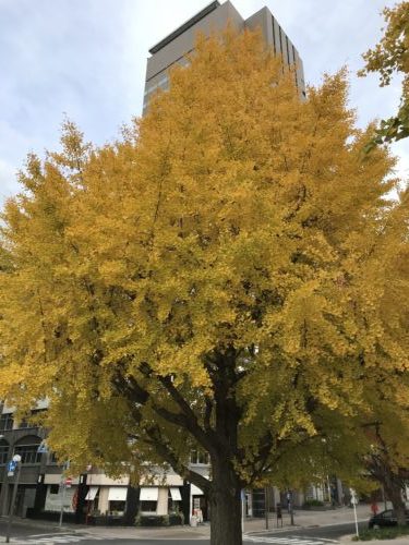 さて、今日パークサイドホテル広島から徒歩2分くらいのところにある平和大通りを歩いていると、イチョウの木が目に留まりました。小さいころから慣れ親しんでいるこのイチョウの木。黄金に輝いていました!見ごろですね~!