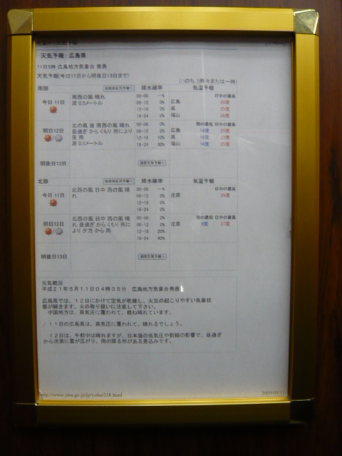 さて、パークサイドホテルでは広島の天気予報をエレベーターの中に掲示しております。