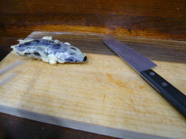 ホルモンの天ぷらは目の前にある、まな板と包丁で