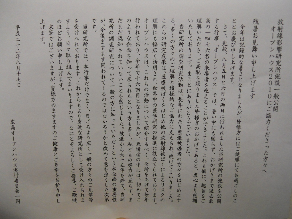 放射線影響研究所さんからご利用いただいた皆様へ2010/08/18 11:02 am