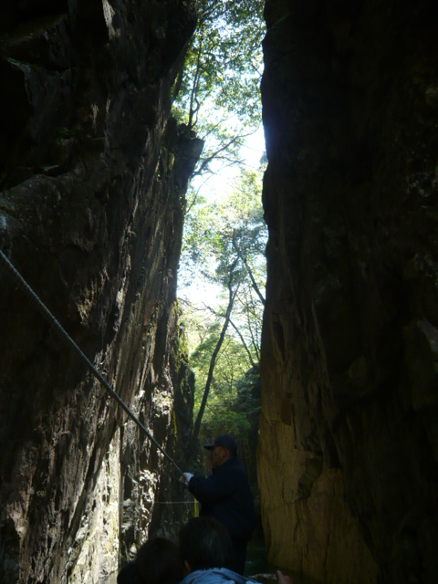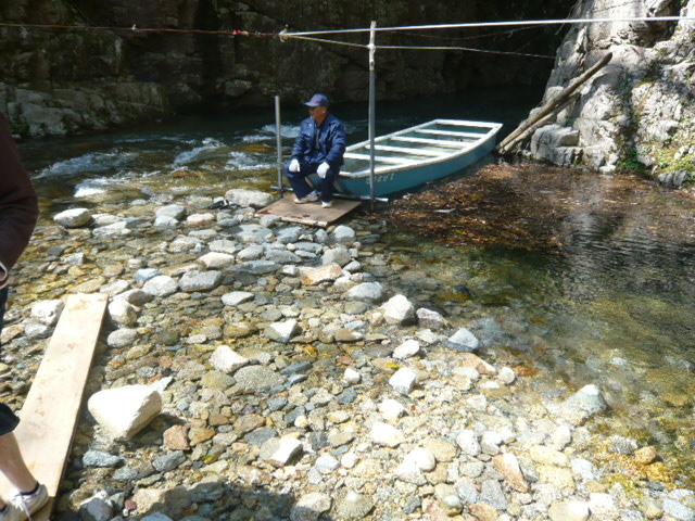 この船は峡谷の中に張ってあるロープを船頭さんが