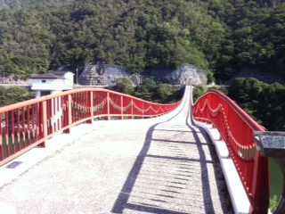何が世界一かというと、橋脚を持たない吊床版橋(つりしょうばんきょう)として世界一の
