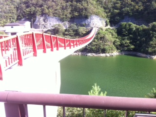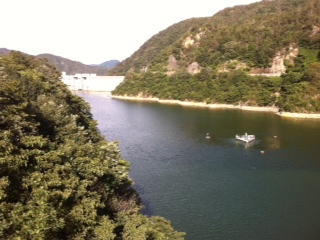 夢吊橋から下を見下ろすと、八田原ダム(芦田湖)が目下に広がっています。