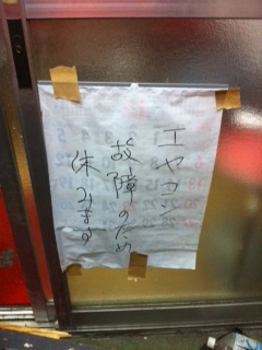 すると、入口に、、、、、クーラーが故障していますとの張り紙が、、、
