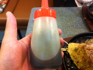 昔ながらの二つ折りにされたお好み焼きと一緒になにか調味料が、、、、