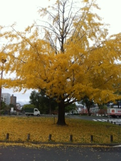 急いで会社にむかっていると、、、平和大通りの毎日みているイチョウの木が、、、