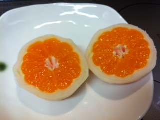 おもしろいですね〜!外のお餅とみかんの間に薄〜く白あんが入っているんです。