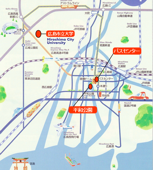 ・広島市中心部(紙屋町)のバスセンター(乗り場4番)からバスで約20分。