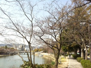 平和公園の川沿いを見ると、うっすら木々がピンクに見えますので。