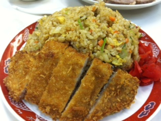 カツにちょっとソースをかけながら、そのソースが焼飯に