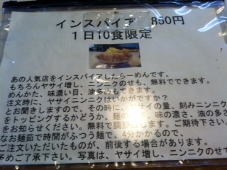 カウンターしかあいていなかったので、そちらでメニューをみていると裏側にインスパイアの説明が!なるほど、、、、ということで注文!初心者なので、普通にしてもらってニンニクだけお願いしてみました。