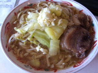 じゃん!こちらがインスパイア!麺が中太麺でしょうか、これもラーメン二郎さんの特徴なのかな。
