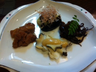 今日の先付は、ニシ貝、茄子、ホタルイカ、魚のキモ、魚の子という内容からスタート!これがまたうまいんですよね〜!